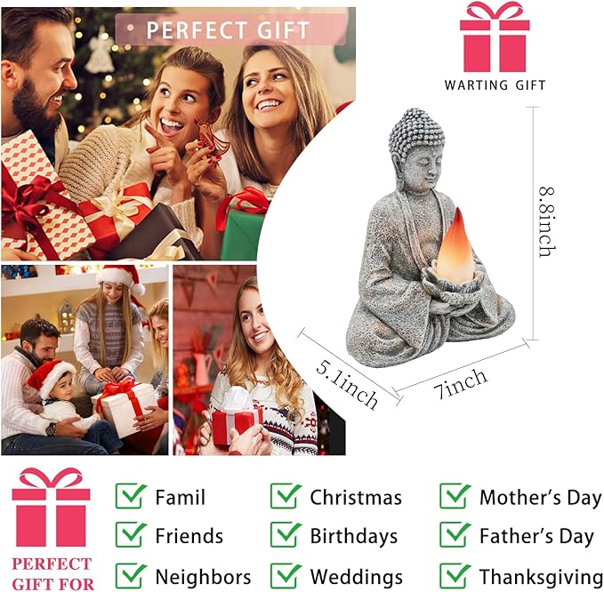 • 【Unique Design】 -Made of polyresin, 7.8“x4.7”x8.66‘’. Perfect addition to your garden,Wonderful outdoor garden decoration for Shakyamuni statue sitting cross-legged in meditation pose while holding a lotu flowers and a candle.