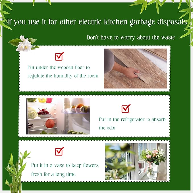 • MULTIPURPOSE: If you use it for other electric kitchen garbage disposals, don't have to worry about the waste due to the quantity, because our activated charcoal can also be put under the wooden floor to regulate the humidity of the room, and also put in the refrigerator to absorb the odor, or put it in a vase to keep flowers fresh for a long time. Used and discarded bamboo charcoal can be buried in the garden to change the quality of the soil.