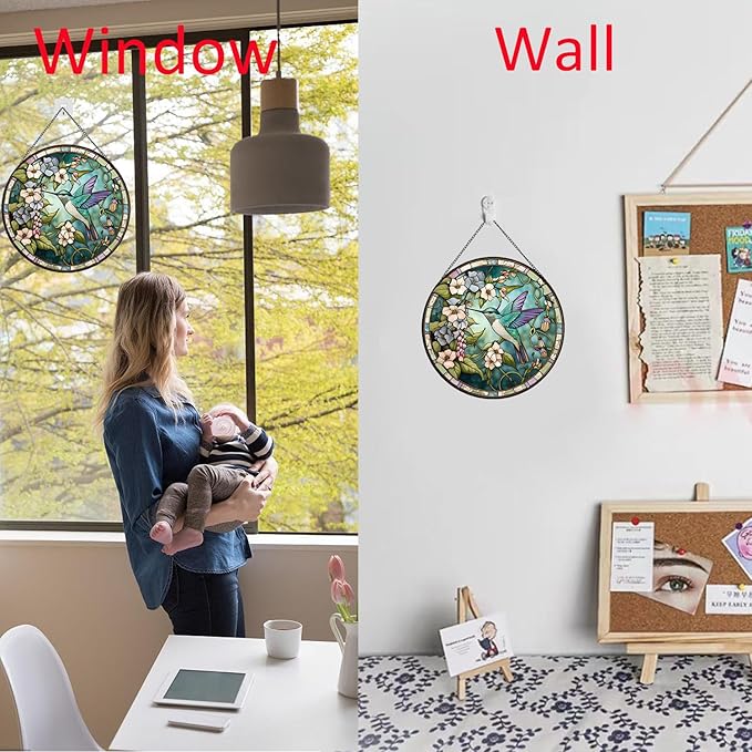 • 【Great Home Decor】This stained glass window hanging painted a hummingbirds and flowers, vivid and full of vitality. Ideal for those who love pastoral and nature, and seek a return to original nature! You can hang it in the position you want to decorate,it's a great home decor.