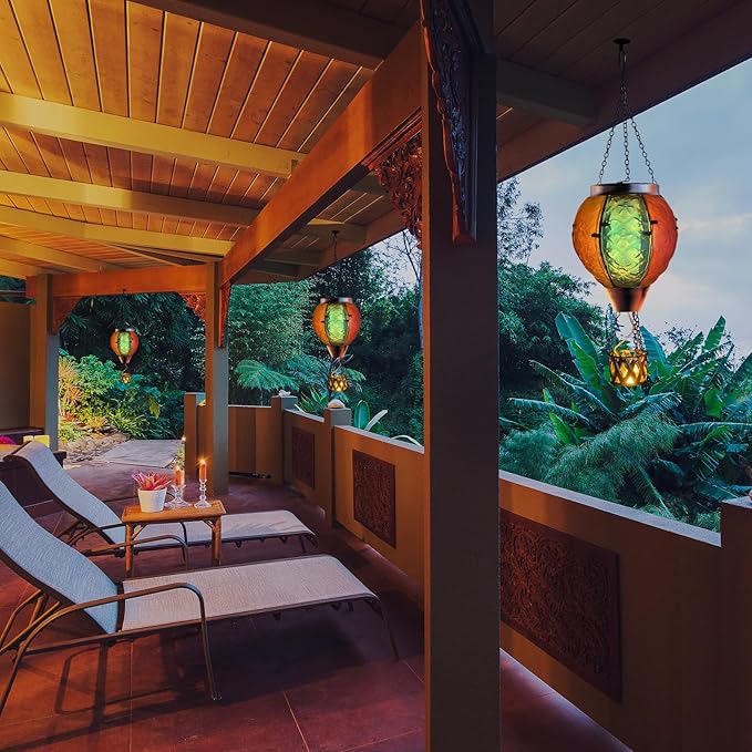 • Solar Powered - Solar hanging lanterns outdoor with solar panels on top that turn on and off to absorb solar energy and charge during the day and light up automatically at night, flashing lights like flames bring an active atmosphere to your yard. Charge 6-8 hours can be illuminated 8-10 hours.