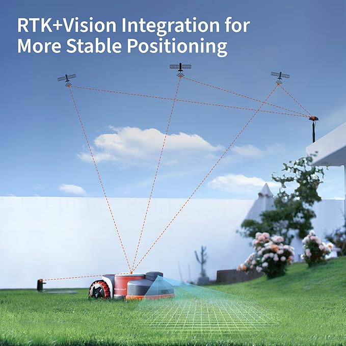 • RTK+Vision Integration for More Stable Positioning: Navimow robot lawn mower integrates RTK positioning and advanced vision technology, greatly improving positioning stability. In places with weak signals or light tree coverage, Navimow can rely on its visual recognition to continue mowing without going out of boundaries
