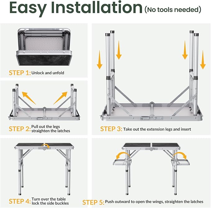 • Simple 5-step Installation (No tools needed). Step 1: Unlock and unfold. Step 2: Pull out the legs and straighten the latches. Step 3: Take out the extension legs and insert. Step 4: Turn over the table and lock the side buckles. Step 5: Push outward to open the wings, straighten the latches. Done. Please refer to the installation steps in the picture and the video.
