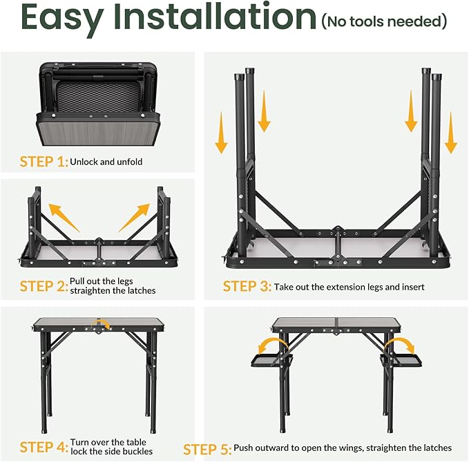 • Simple 5-step Installation (No tools needed). Step 1: Unlock and unfold. Step 2: Pull out the legs and straighten the latches. Step 3: Take out the extension legs and insert. Step 4: Turn over the table and lock the side buckles. Step 5: Push outward to open the wings, straighten the latches. Done. Please refer to the installation steps in the picture.