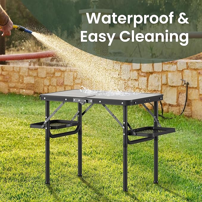 • Lightweight & Strong Load-bearing. Our folding camping table is made of 90% aluminum & 10% density board, ensuring that it is light and strong at the same time. The picnic table is 6 lbs heavy and supports up to 70 lbs, and each wing supports up to 20 lbs.