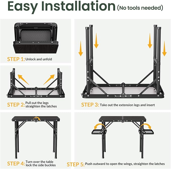 • Simple 5-step Installation (No tools needed). Step 1: Unlock and unfold. Step 2: Pull out the legs and straighten the latches. Step 3: Take out the extension legs and insert. Step 4: Turn over the table and lock the side buckles. Step 5: Push outward to open the wings, straighten the latches. Done. Please refer to the installation steps in the picture and video.