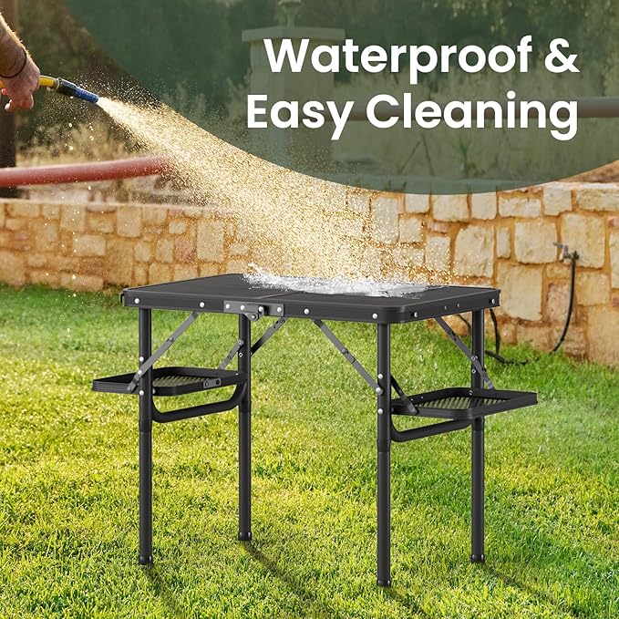 • Lightweight & Strong Load-bearing. Our folding camping table is made of 90% aluminum & 10% density board, ensuring that it is light and strong at the same time. The picnic table is 6lbs heavy and supports up to 70 lbs, and each wing supports up to 20 lbs.