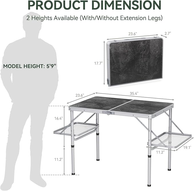 • Lightweight & Strong Load-bearing. Our camping table is made of 90% aluminum & 10% density board, ensuring that it is light and strong at the same time. The picnic table is 12lbs heavy and supports up to 80 lbs, and each wing supports up to 30 lbs.
