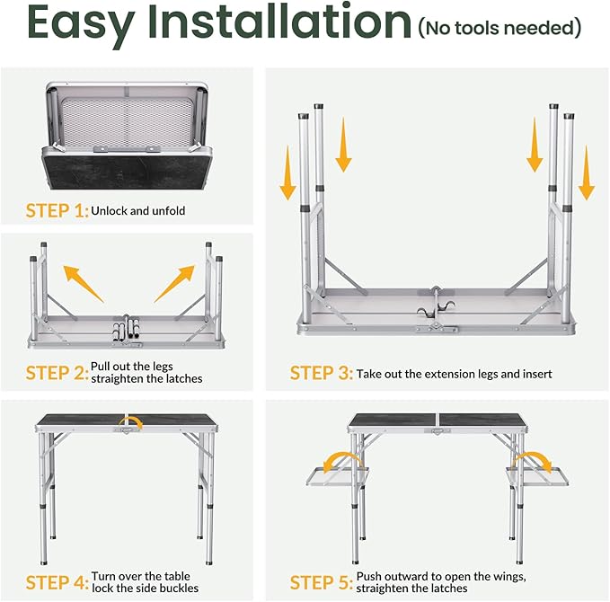 • Simple 5-step Installation (No tools needed). Step 1: Unlock and unfold. Step 2: Pull out the legs and straighten the latches. Step 3: Take out the extension legs and insert. Step 4: Turn over the table and lock the side buckles. Step 5: Push outward to open the wings, straighten the latches. Done. Please refer to the installation steps in the picture.