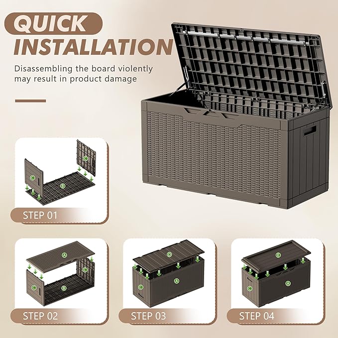 • Durable Resin Material: Deck box is made of waterproof resin, with a complementing rattan pattern design, effectively preventing fading and rusting, while also maintaining a fresh appearance even with all-weather use
