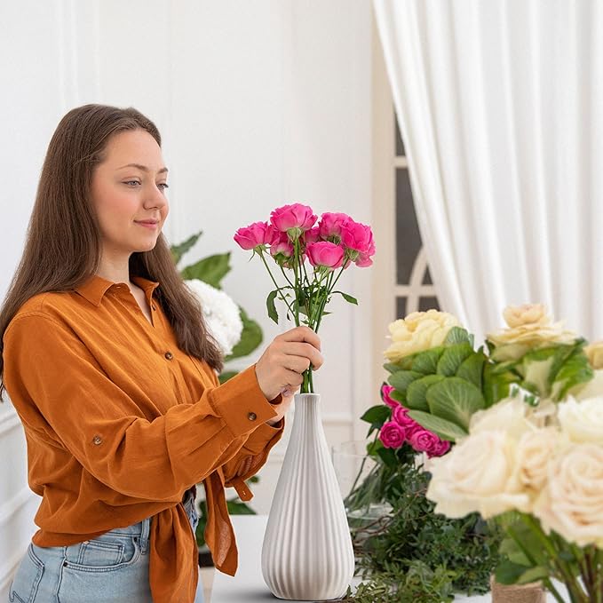 • Pack of 3 Vases Dimensions: Each small white vase measuring 12"x 8.5" are perfect for showcasing your favorite blooms, as a centerpiece vases for table, or as standalone pack of 3. They each have a slightly different look (Horizontal Stripes, Verticle Stripes and Smooth Finish).