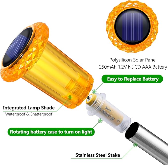 • OUTDOOR DURABILITY: The integrated acrylic lamp head is tightly connected to the battery base and equipped with stainless steel stakes, there are no external metal parts. It is waterproof, dustproof and rust proof. Therefore, solar lights for outside can be used in rain, snow or high temperatures.