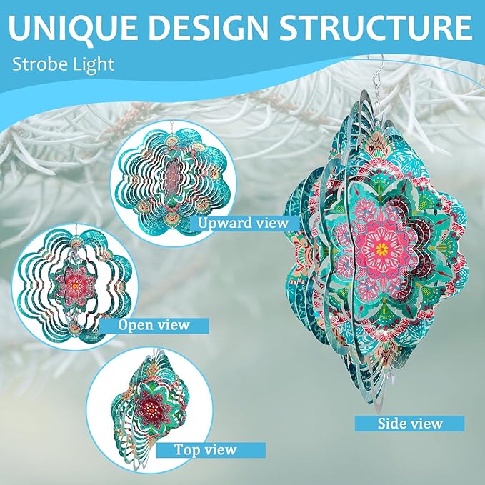 • ღ【Durable Yard Garden Decor】Our hanging wind spinner are made of durable stainless steel by laser-cutting technology to form vivid shape,it delivers a wave of mesmerizing patterns that will surely delight any spectator.Individually hand painted epoxy protective coating with colored glitter inside,has better outdoor weather resistance,not easy to rust. Beautiful patterns that sparkle & won’t fade in the sun.