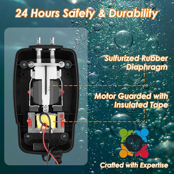 • ULTRA QUIET - This koi pond aerator is designed for minimal noise, featuring a straight air flow path, vibration-absorbing rubber feet, and an interior housing design with a unique texture. You can adjust the air flow using the dial at the top.