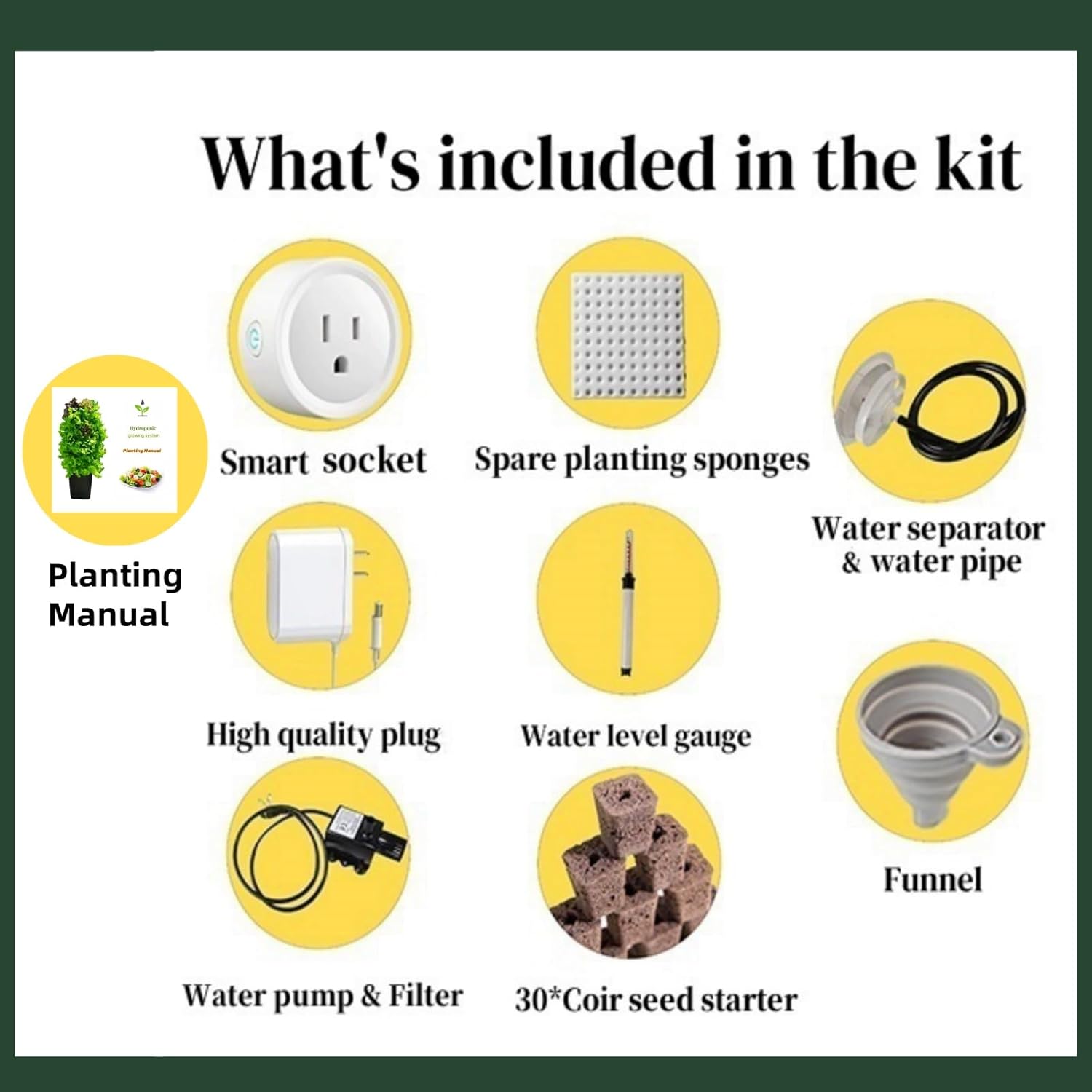 • This hydroponic indoor gardening kit includes: a silent water pump, smart socket, 30 coconut seed starters, a planting manual, water level indicator, funnel, and spare planting sponge 64pcs.Please note that seeds and plant food are not included.