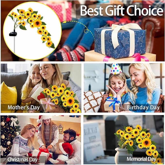 • Garden Decorations & Unique Gift: Solar sunflower lights can enhance the beauty of your garden, lawn or patio. Their unique design and warm glow create a charming atmosphere, ideal for outdoor decorations and evening Fall decor. In addition, they are a unique garden gift, perfect for women who love gardening