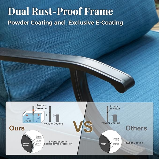 • 【RELIABLE ALL-WEATHER METAL CONSTRUCTION】Built from durable metal with E-COATING and POWDER-COATING finish, ensuring resistance to all weather conditions, rust-proof qualities, and easy maintenance. The sturdy wrought iron frame can withstand various weather conditions, with the single chairs supporting up to 350 lbs and the 3-seater sofa accommodating up to 900 lbs, promising long-lasting reliability and durability.