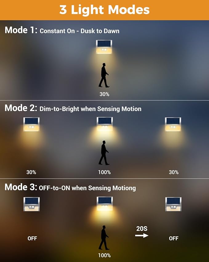 • Smart PIR Motion Inductor: vighep solar lights outdoor offer 3 lighting modes for versatile functionality. 1. Motion Sensor Mode: Lights turn on when people approach, ensuring safety and convenience. 2. Permanent On Mode: Lights stay illuminated all night for continuous visibility. 3. Smart Brightness Control: Lights stay on all night and automatically brighten when motion is detected, optimizing energy efficiency and enhancing security.