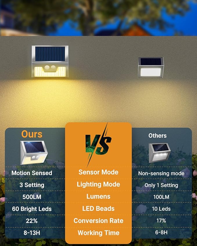 • Faster Charging-Longer Illumination:This solar motion activated light boasts a supercharged solar panel with a 20-22% conversion rate, meaning it charges up quicker during the day. That translates to longer illumination at night, keeping your outdoor space brightly lit for enhanced safety and security