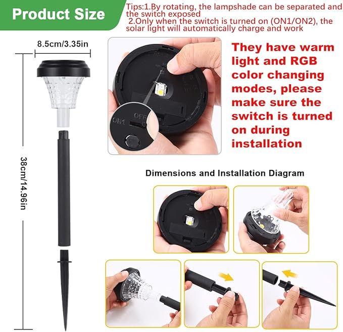 • [2 Mode Outdoor Solar Decorative Light] The solar path lights outdoor can be switched between color changing mode or warm light mode through a switch, which can decorate your patio, garden, or any sunny place, adding a wonderful atmosphere to your yard