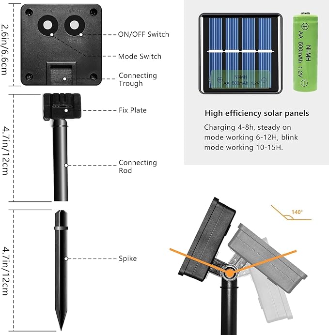 • 【8 Twinkle Modes & Memory Function】: These solar mini lights have the mode button and ON/OFF button. You can select 8 different modes to satisfy your diverse needs: combination, in waves, sequential, slo-glo, chasing/flash, slow fade, twinkle/flash, steady on. And the built-in memory chip saves your last modes setting, so there is no need to reset it again.