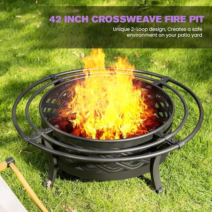 • 【Charming&Exquisite Fire Pit】Panovue 42inch black iron fire pit has a round shape and stands 24 inches high.The overall dimensions of the fire pit is 42''*42''*24'',the fire bowl size is 32''*32''*9'',allowing it to hold up to 20-30 lbs of firewood,The wood burning fire pit’s enchanting design features a stylish cross-weave pattern, giving your backyard a touch of elegance.Imagine relaxing by the warm glow of the flames in your outdoor area.