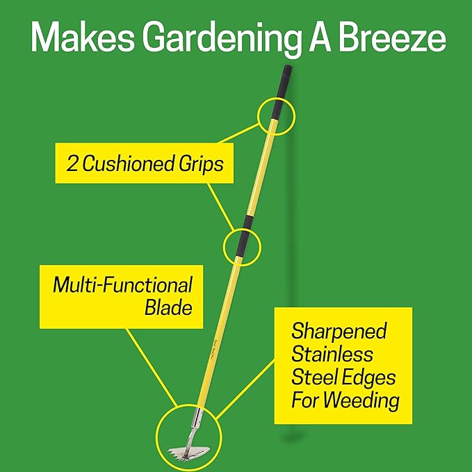 • GARDEN COMFORTABLY- Our 59” long garden hoe handle lets you stand upright, eliminating back strain from bending over, making gardening a breeze. Developed with 2 cushioned grips to ensure a secure and comfortable hold so you can work longer with ease