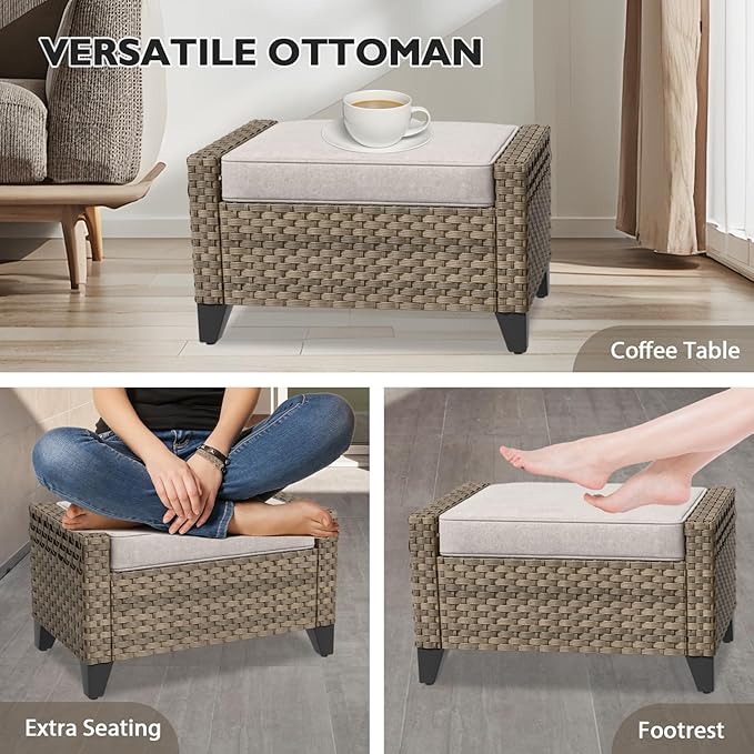 • STYLISH WICKER: This 4 piece rattan furniture set, includes 2 sturdy armrest chairs and matching ottomans, that provide support for you neck, back arms and legs. Tramsform your garden, balcony, deck, patio, porch, sunroom, yard or poolside oasis with this outdoor furniture set.