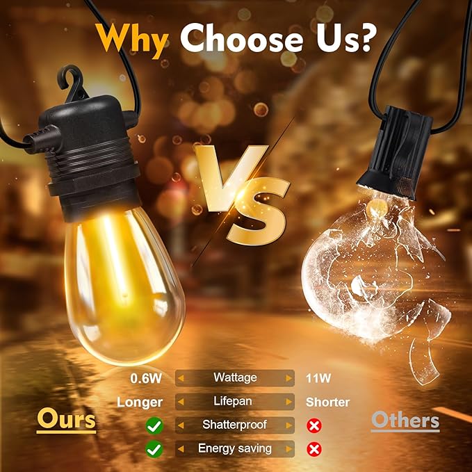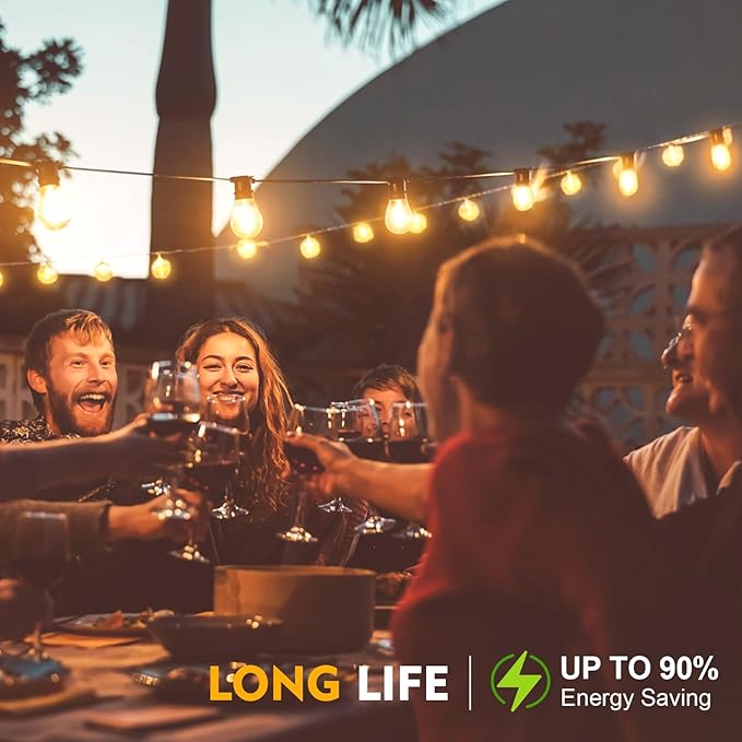 • 【Weatherproof String Lights for Outside】Rain or shine, our S14 string light bulbs shine bright, resilient against rain, wind, and extreme temperatures. Featuring shatterproof bulbs and stable construction, safety is paramount—no more worries about broken glass shards!