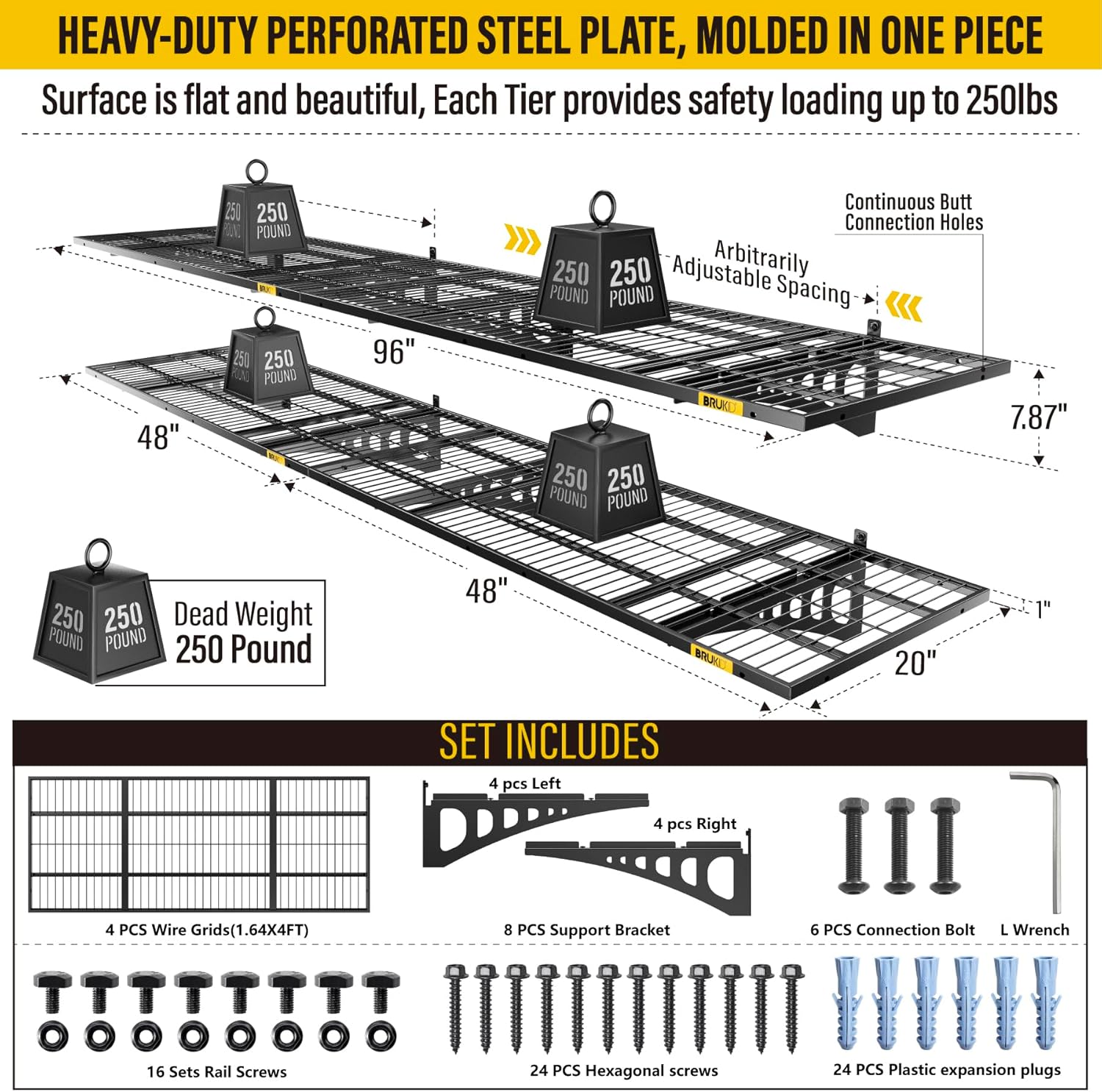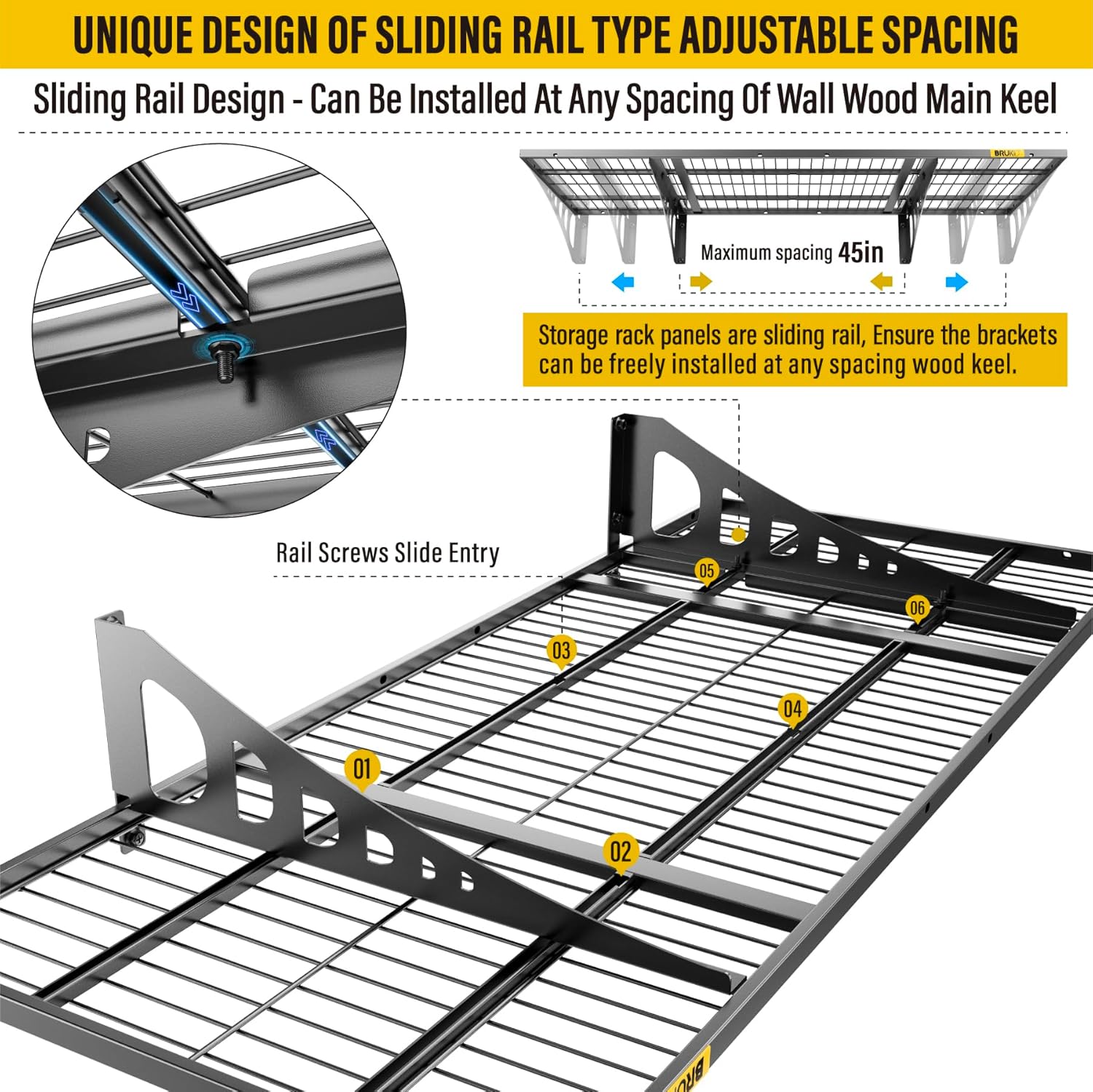 • SUPERIOR DESIGN: Wall shelf garage storage rack is made of heavy-duty frame structure and thicker wire mesh combined with welding, the panel and bracket connection is adjustable slide rail design, Both ends of the bracket can be installed freely in the 8"-45" range of wood wall keel spacing. Eliminating the worry of not being able to connect due to the mismatch of the spacing of the load-bearing wooden wall keel