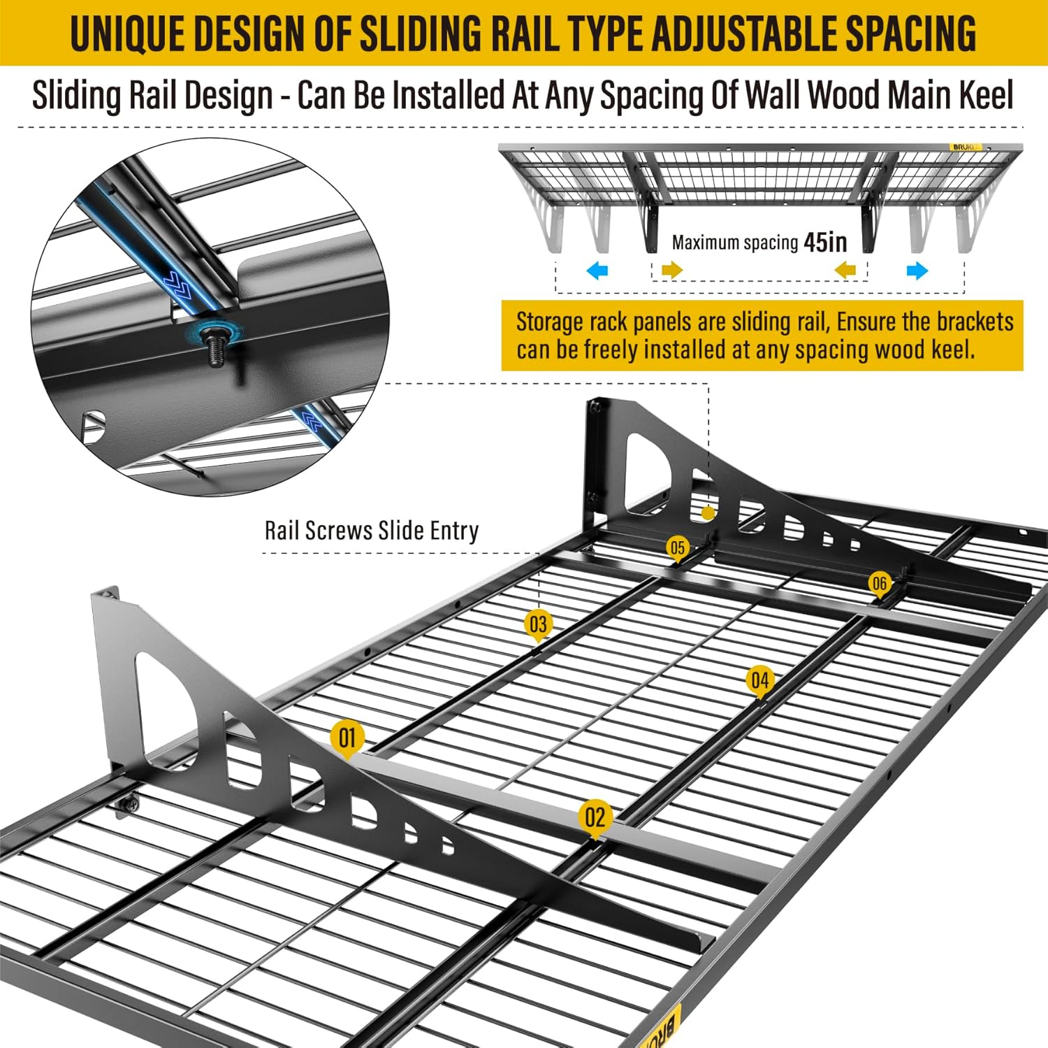 • SUPERIOR DESIGN: Wall shelf garage storage rack is made of heavy-duty frame structure and thicker wire mesh combined with welding, the panel and bracket connection is adjustable slide rail design, Both ends of the bracket can be installed freely in the 8"-45" range of wood wall keel spacing. Eliminating the worry of not being able to connect due to the mismatch of the spacing of the load-bearing wooden wall keel.