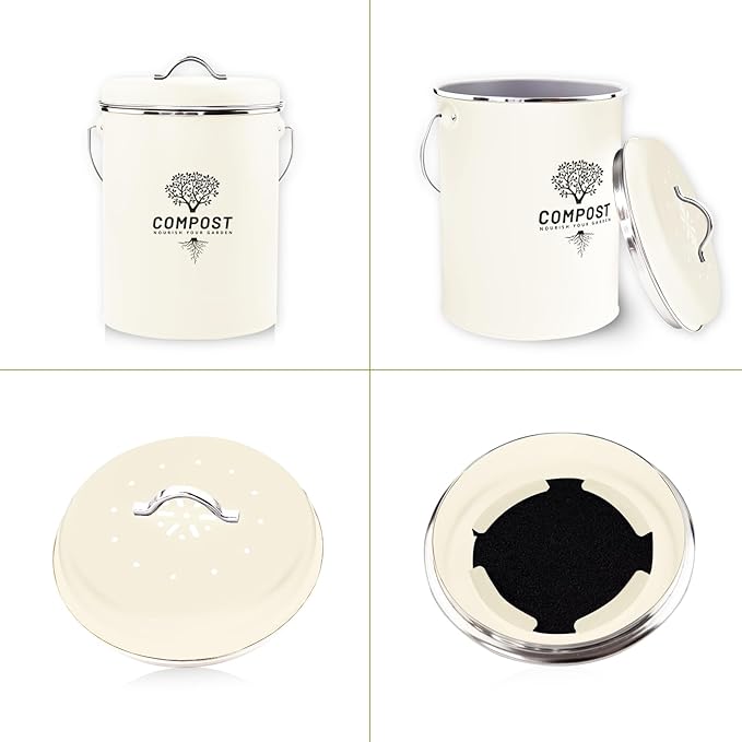 Kitchen Countertop Compost Bin, Odor Resistant Indoor Compost Bin with Lid and Charcoal Filter, Rust Resistant Coated Compost Bucket, Compost Container, Cream