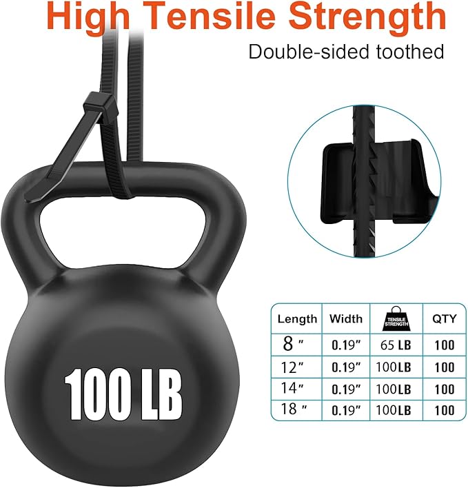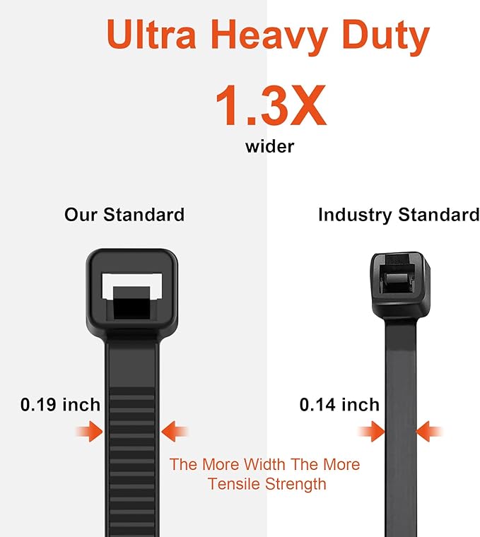 • 【100lb Tensile Strength】: The more width and Thickness, the more tensile strength. our zip ties 12 inch width is 0.19 inch(4.8mm), while industry standard is 0.14 inch(3.6mm), our zip ties 12 inch Thickness is 0.065" inch(1.65 mm), while industry standard is 0.05 inch(1.25mm),more tensile strength.