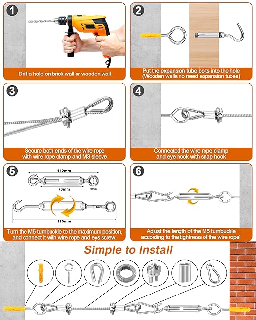 • [Versatile Applications] Premium coated stainless steel cable with adjustable turnbuckle tensioners and versatile hooks and anchors ensure safety, stability, and weather resistance for any occasion. Whether you’re setting up an outdoor tent, creating decorative rope displays, or hanging party lights, our wire rope kit has you covered. It’s perfect for outdoor string lights hanging, festival decorations, clotheslines, fences, plant traction ropes, and even picture displays in your backyard
