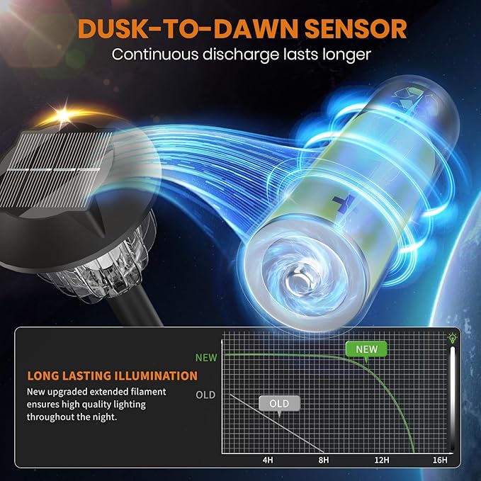 • DUSK TO DAWN LIGHT UP LANDSCAPE LIGHTING: Solar power lights automatically turn on at night and turn off at dawn which enables led pathway light conserves battery life for when it’s needed most. The lights provide a good amount of illumination after a sunny day.