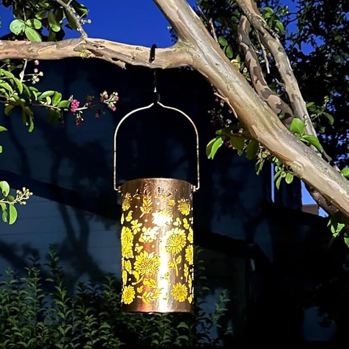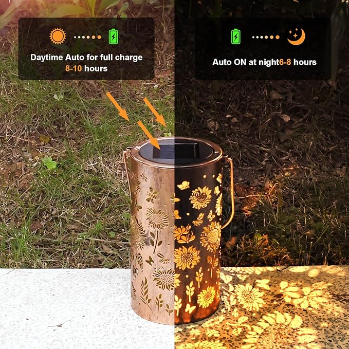 • Beautiful Design: This hanging solar lantern sunflower light features a warm white LED lens design and with vintage hollow design, warm lighting vivid sunflower pattern will cast beautiful patterns on the wall or ground, bringing life and fun to your garden, and also a creative light for garden patio and decking. SIZE: 7.1 "H x 3.9 "W x 3.9 "L
