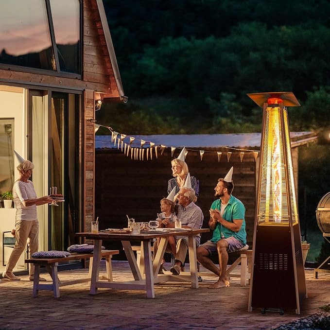 • 🔥【Eye-Catching Flame】 Standing at 89.4 inches tall, this pyramid patio heater boasts a captivating glass flame tube that enhances any outdoor setting.