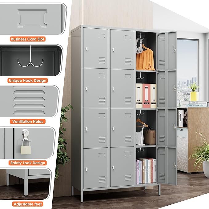 12 Doors Metal Storage Locker, 72" H Employees Lockers Storage Cabinet with 12 Hooks for Home, Office, Gym, School, Assembly Required, Light Gray