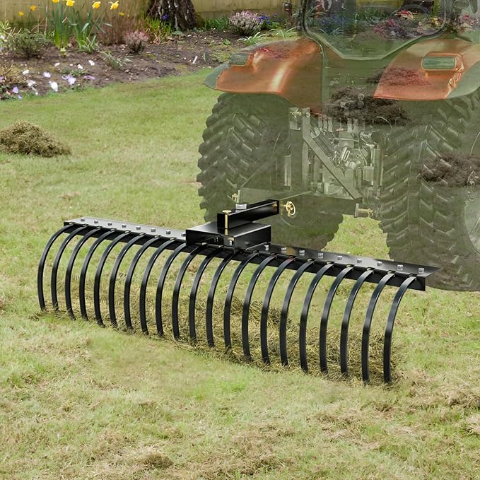 • Universal Compatibility: The lawn tractor rake can be used with 48" or 60" toolbars and three-point suspension systems, easily connecting to various ATV farm machines.