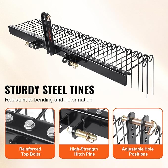 • Wide Working Width: With a 72'' working width, the tow behind landscape rake covers large areas, increasing efficiency and saving time. It is the ideal tool for efficiently cleaning large yards and lawns.
