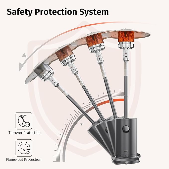 • ๐——๐—ผ๐˜‚๐—ฏ๐—น๐—ฒ ๐—ฆ๐—ฎ๐—ณ๐—ฒ๐˜๐˜† ๐—ฃ๐—ฟ๐—ผ๐˜๐—ฒ๐—ฐ๐˜๐—ถ๐—ผ๐—ป ๐—ฆ๐˜†๐˜€๐˜๐—ฒ๐—บ: The Tip-over Protection system will shut off the flame when the patio heater propane is tilted more than 45 degrees. If the flame goes out, the Flame-out Protection system automatically shuts off the gas supply