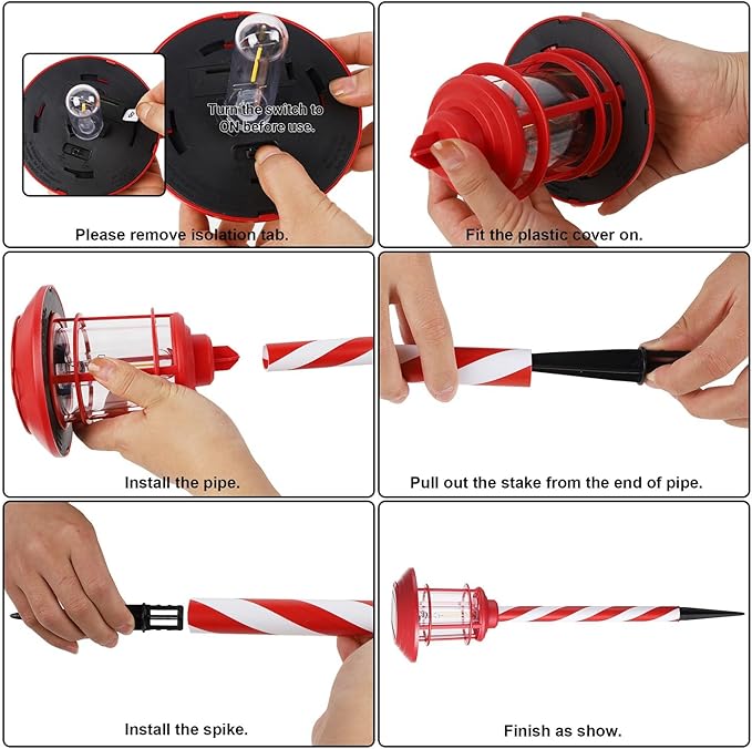 • SOLAR XMAS PATHWAY LIGHTS: Connect the light, pole and stake(inside the pole), insert the stakes into the soft soil or ground where there has direct sunlight. Solar LED pathway lights, add a 360 degree viewing angle illuminate charming to your outdoors, produces a very calm and impressive atmosphere. Size with Stake- 4.9 x 4.9 x 19.1 inches