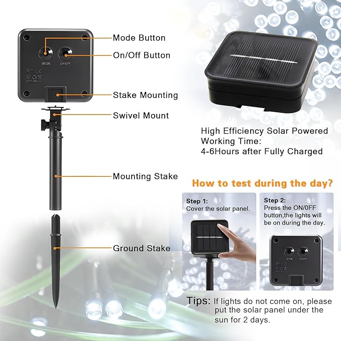 • 【IP65 Waterproof & Excellent After Sale Service】Solar string lights outdoor waterproof have IP65 waterproof rating and can withstand severe weather. If you are not satisfied with your purchase, please contact us. We will reply you within 24 hours and deal with it until you are satisfied.