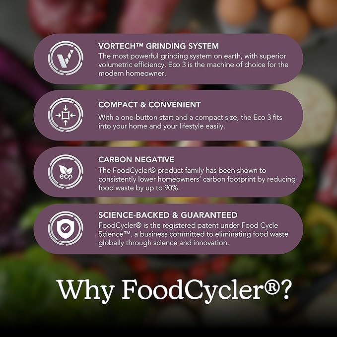 • TRANSFORM KITCHEN WASTE INTO PLANT FOOD -WITHOUT LIFTING A FINGER: The NEW FoodCycler Eco 3 is a convenient electric kitchen composter alternative to eliminate food waste. Ideal for the busy home, the Eco 3 quietly grinds your food waste into plant food, reducing the amount of trash you take out.