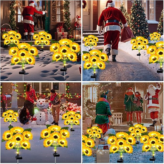• 2025 Upgraded Sunflower Solar Lights:Compared with ordinary solar flower outdoor lights,each flower lights contains 6 sunflowers,a total of 24 sunflowers.delicate and realistic sunflower decorative lights make your garden more lively and pleasant.The petals,leaves and buds are designed to be more elaborate and realistic than other sunflower decorations.