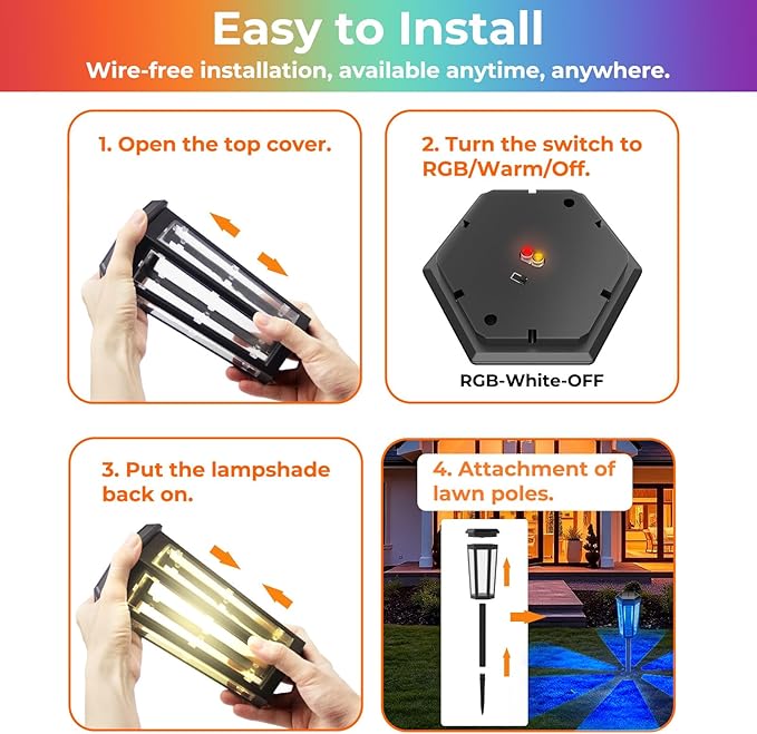 • 【Auto On/Off, Save Money】100% solar energy, outdoor solar lights will auto absorbs sunlight during the day and auto light up at night. Simply turn on the switch before the first use. The solar lawn lights is specially designed for you and fully practical which saving the workforce and expensive electricity bill, perfect for landscape lighting decor.