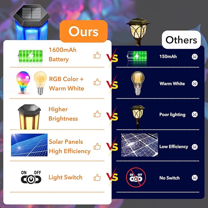 • 【High Efficiency Solar Panel】 Compared with cheap outdoor solar lights, Gedaye is made of imported monocrystalline silicon solar panels and 1600mAh rechargeable Ni-MH batteries, it only takes 6 hours to fully charge, which can provide 10-12 hours of illumination with up to 30% solar energy conversion. Using LED beads, brighter and longer life than tungsten lights.