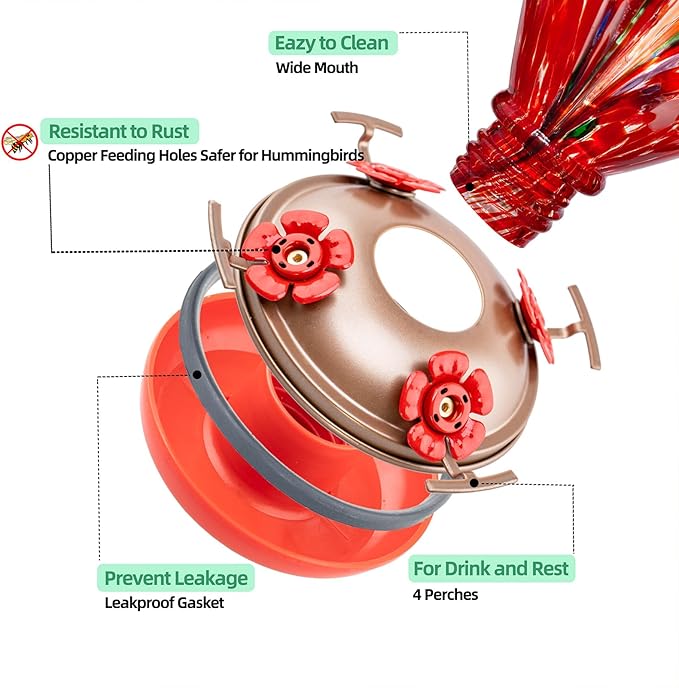 • 【Leakproof and SAFER Feeder Ports】The metal base is equipped with sealing ring and plastic basin for leakproof. UPGRADED feeder ports are made with premium copper materials, no sharp edges . Make sure the gasket is securely attached before you hanging the hummingbird feeders outside.
