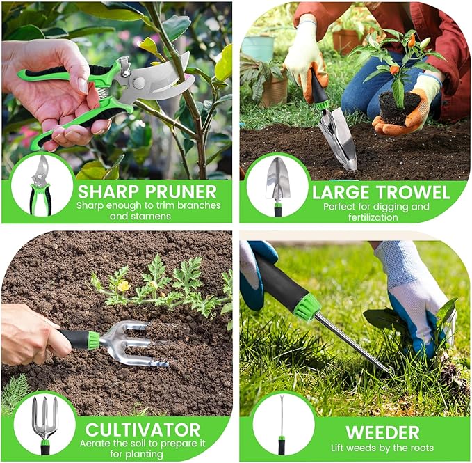 • 【Two Removable tool bag & 4 Heavy Duty Garden Tools】 The gardening tool sets includes a large trowel, cultivator, weeder, pruning shears and an Oxford cloth Tool hand bag+tool pouch to keep all your tools packed away provides everything you need to maintain a beautiful and healthy garden.