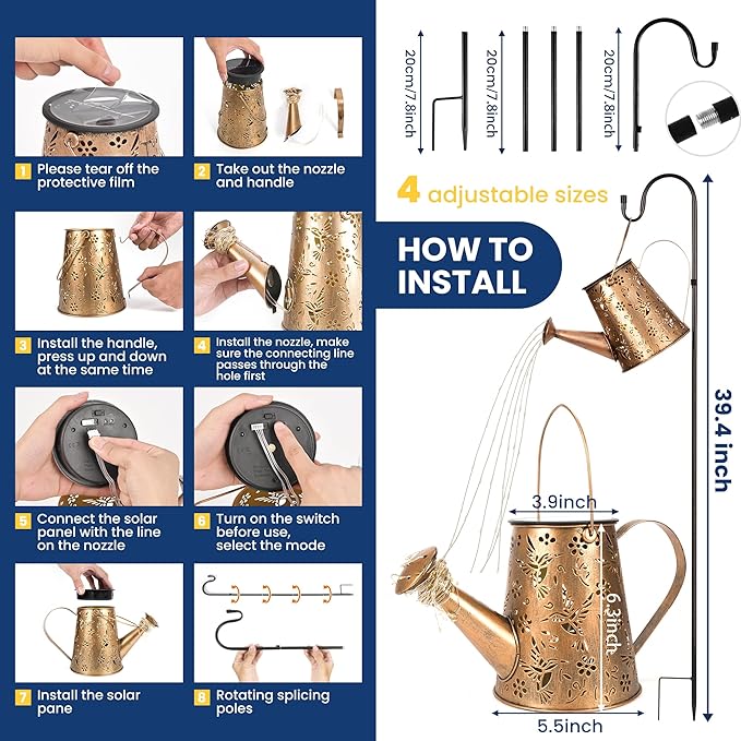 • Dimensions and Specifications: The solar garden light is made of durable metal, including the watering can body, spout, and handle. It comes with a ground stake composed of five 7.8-inch sections, allowing you to customize the height as needed