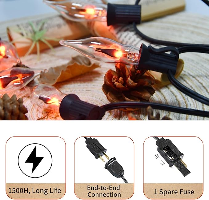 • 🔥【Clear Flame Lights Specifications】: This unique fake flame Christmas light string is 12.8 feet in total length with 39.5 inches / 1 meter male plug leads, 12 inches spacing between bulbs, and 6 inches female plug leads. Each string of flame lights has a total of 10 clear glass flame bulbs and 2 spare C18 clear flame bulbs, 1 watt, 120 volts. Flashing Christmas lights provide 2000+ hours of illumination and are safe and durable, eliminating the need for frequent bulb changes.